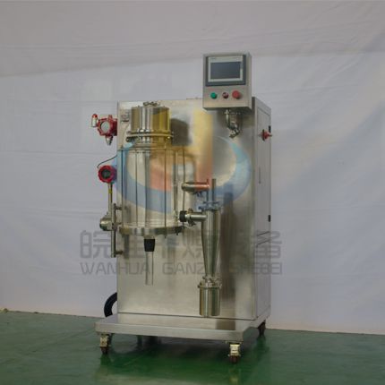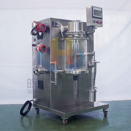 小型噴霧干燥機主要在科研階段對溶液或流體樣品進行噴霧干燥成粉或微小顆粒。其原理是通過霧化器將樣品霧化成微細霧滴,進入干燥室內進行熱交換,水份瞬間蒸發,固體經過旋風分離器進行回收,飽和氣體經過除塵器過濾后排空,本設備可應用于從試驗室到一般研究室的噴霧干燥作業,在食品醫藥化工行業均可良好的應用。 設備特征與設計結構: 2、噴霧后的微粉末,水分含量低、不會氧化(熱敏性物料除外)、無污染。 10、本機設計在進風口做了均風裝置,可在干燥過程中對粘性物料減少黏壁問題