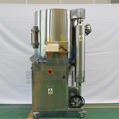 噴霧干燥機為開式循環,并流式,離心式霧化。干燥介質空氣經過初、中效空氣過濾器過濾后根據操作指令由鼓風機吸取再經加熱器加熱通過高效過濾器的熱風分配器進入噴霧干燥主塔。液體物料根據操作指令經過蠕動泵,進入高速旋轉的離心噴頭,在離心力作用下被分散成小霧滴。在噴霧干燥主塔內,小霧滴與熱風在充分接觸,沿其特定路徑進行熱交換后被干燥成為產品,然后通過旋風分離器實現分離,固體物料被收集,氣體介質再經過過濾后被排出。整套噴霧系統易清潔、無死角,符合GMP要求。